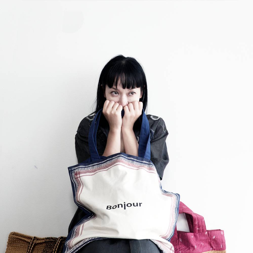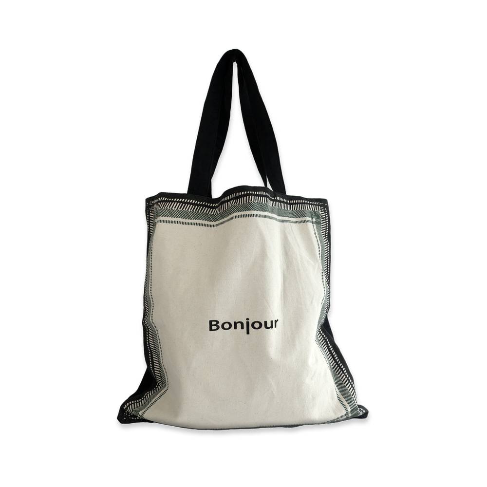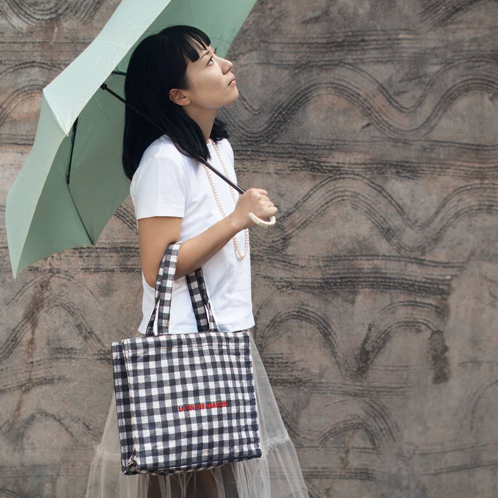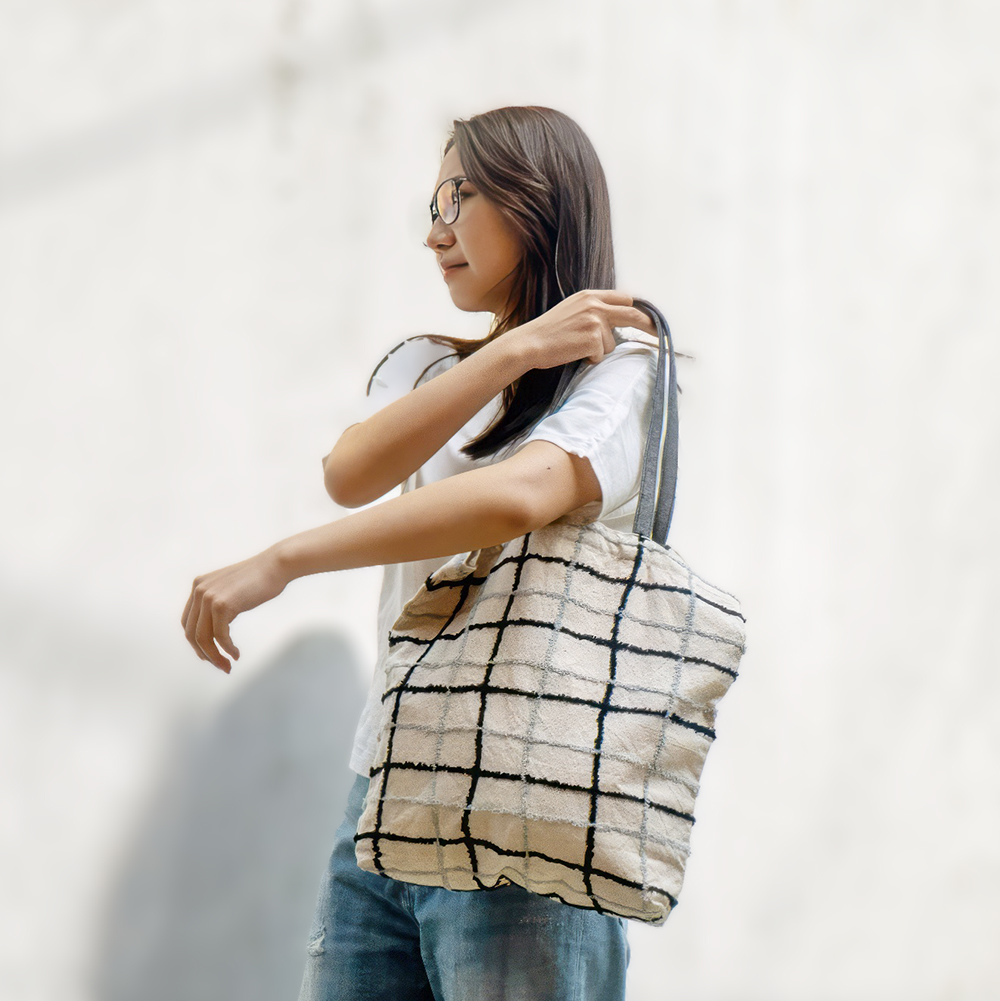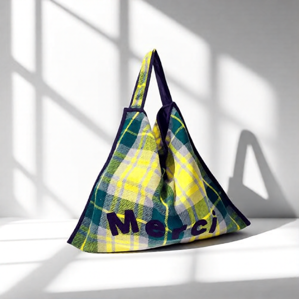 This “Merci Bag” is crafted from an original check fabric woven exclusively for ENA KUAM.